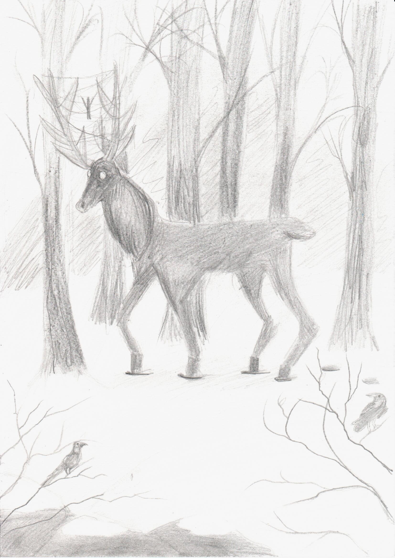 Это создание похоже на призрачного оленя с белыми глазами, которые светятся молочным светом, и тонкими рогами, обросшими паутиной. Паутина на рогах шевелится и кажется живой. Когда существо кричит, по коже бегут мурашки. Если его потревожить, оно может быть очень опасным. Когда оно рядом, становится холодно и страшно.