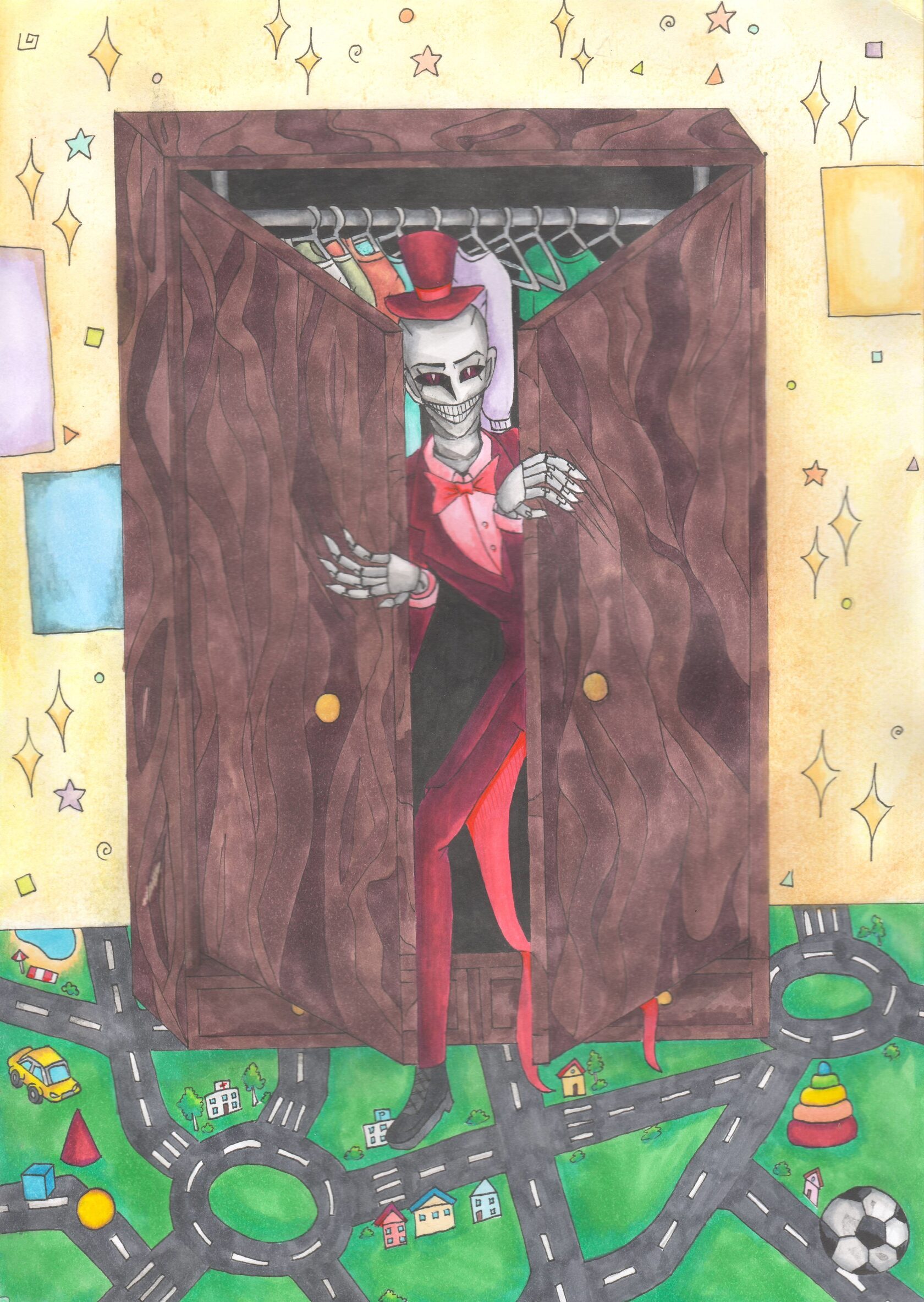 За раздумьями я не заметила, как наступила полночь. Я начала засыпать, как вдруг услышала знакомый звук. Кто-то снова скреб дверцы шкафа. Мне стало жутко. Я постаралась не реагировать на звук. Вскоре звук утих. Кто-то или что-то в шкафу медленно отворило дверцу. Теперь я наконец-то увидела того, кто был причиной моих кошмаров. Это был человек… Хотя нет, не человек. Высокое существо, более чем два метра ростом, одето в красный смокинг и шляпу, с белой кожей и длинными, жуткими пальцами. Существо очень сильно напоминало манекен, прямо как из магазинов с одеждой. Но у таких манекенов нет лиц. У существа был широкий рот, будто деливший голову пополам, с множеством зубов и глаза… Глаза были залиты чем-то темным, а зрачки белые пребелые, светящиеся в темноте. А не тот ли это повелитель тьмы Сетос, про которого мне дедушка рассказывал, когда я маленькая была? Снова вспомнив про дедушкин рассказ, что монстры боятся лунного света в полнолуние, я вскочила с кровати и отдернула штору. Комната наполнилась лунным светом. Издав хриплый смешок, повелитель тьмы растворился в черном дыме. Это явно не конец, но меня он в покое оставил. С этой ночи я больше не слышала скрежета в шкафу, скрипов половиц в комнате, шепота и больше не просыпалась от ощущения, будто кто-то за мной следит. Именно эта история повлияла на мою веру в монстров.