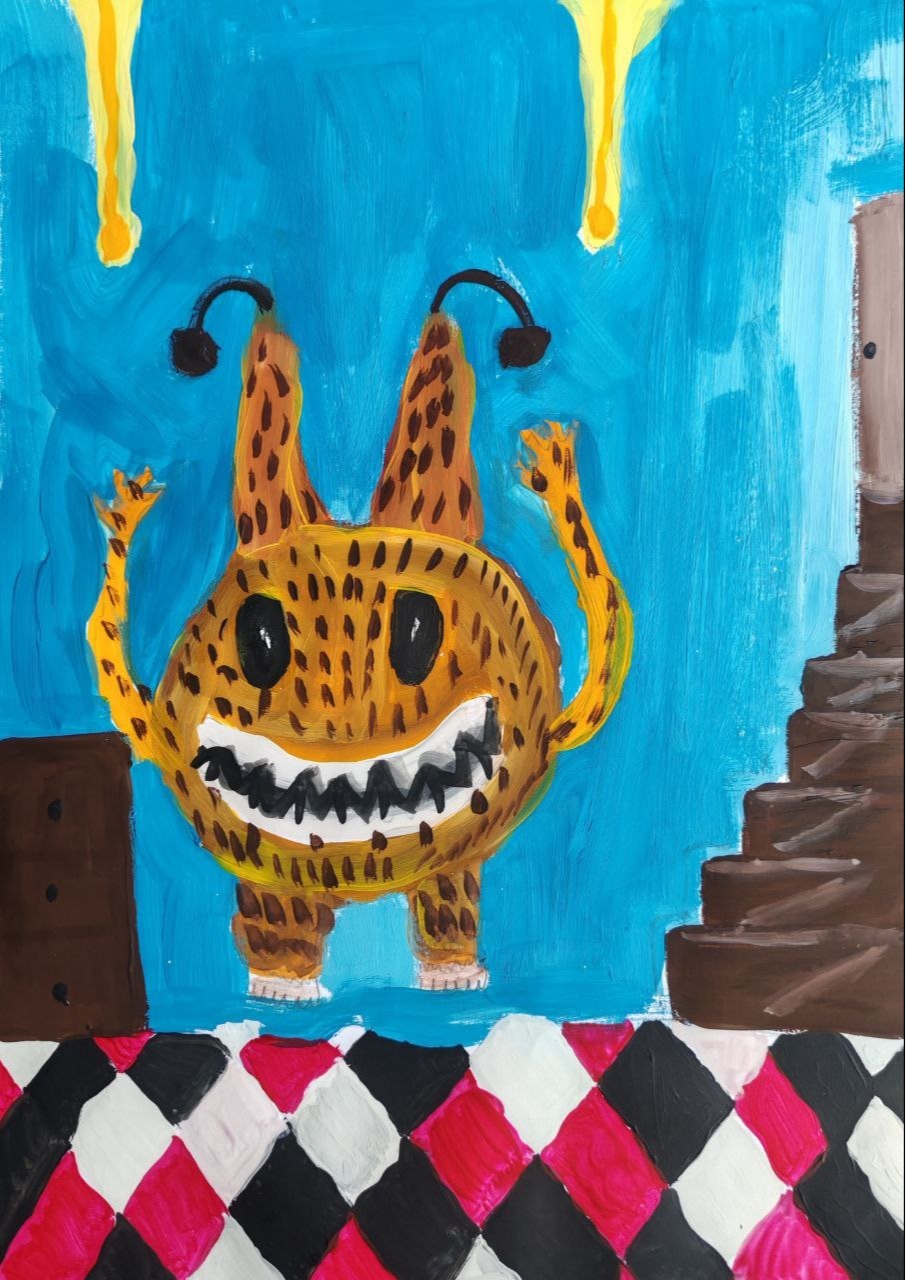 Я изобразила фонарного монстра.Он пугает страшными звуками и темнотой.Он живет в любом из подвалов или в подъезде, чтобы его победить нужно включить свет.