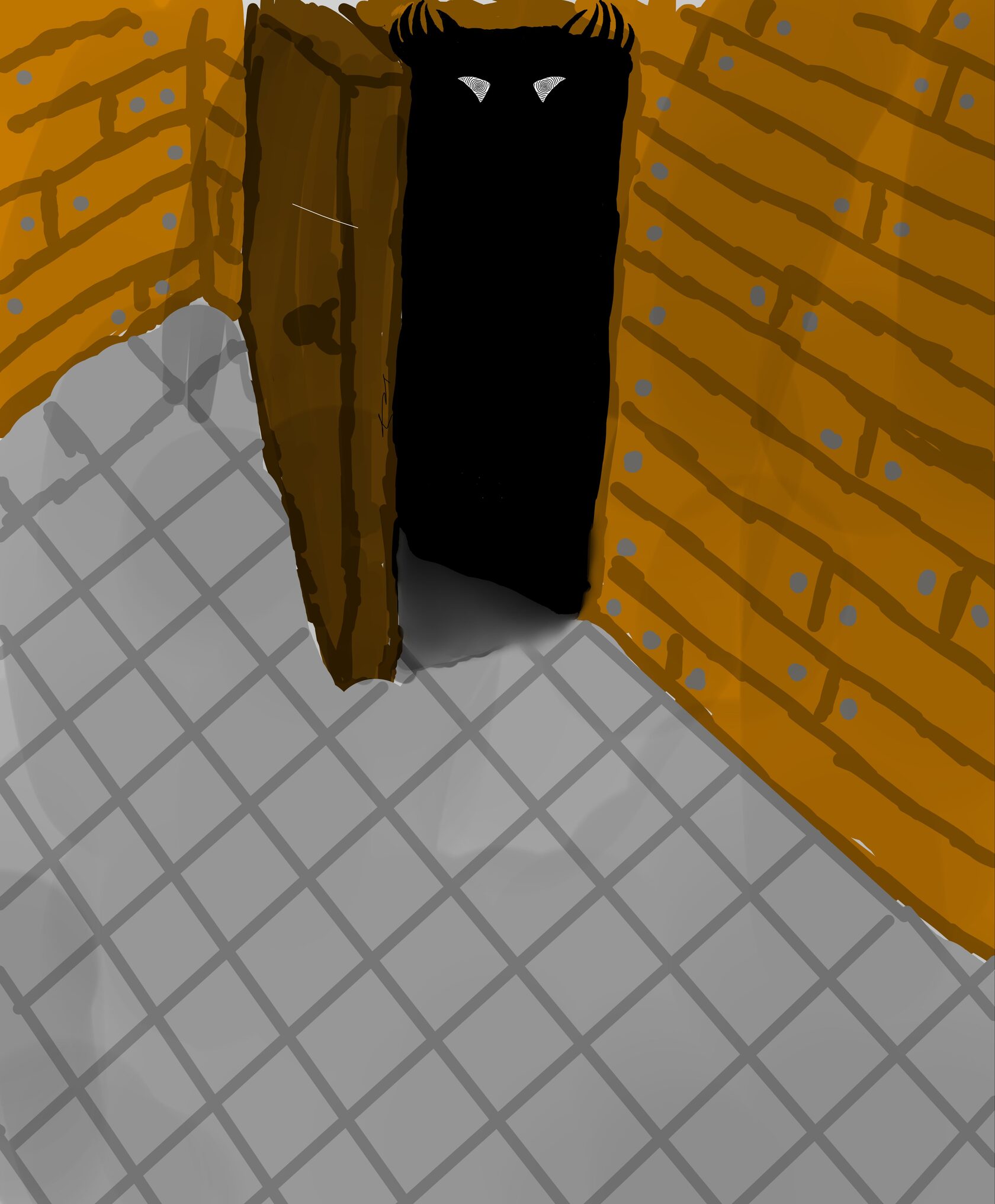 Оно было под 2 метра ростом. Его руки, а точнее пальцы выглядывали из проема двери, а глаза гипнотизировали, отчего я оцепенел. На секунду очнувшись я вспомнил что видел что-то такое в детстве. И страх темноты, который я так долго подавлял, сейчас взял верх надо мной. Вспомнив, что под кроватью лежит ружьё я ринулся туда. Нечто в дверях не стало ждать и набросилось на меня, но я оказался быстрее и выстрелил ему прямо в голову. Монстр пропал, остался лишь страх темноты во всей комнате. И после всего этого, уже у телефона, я рассказываю это вам, товарищ полицейский."